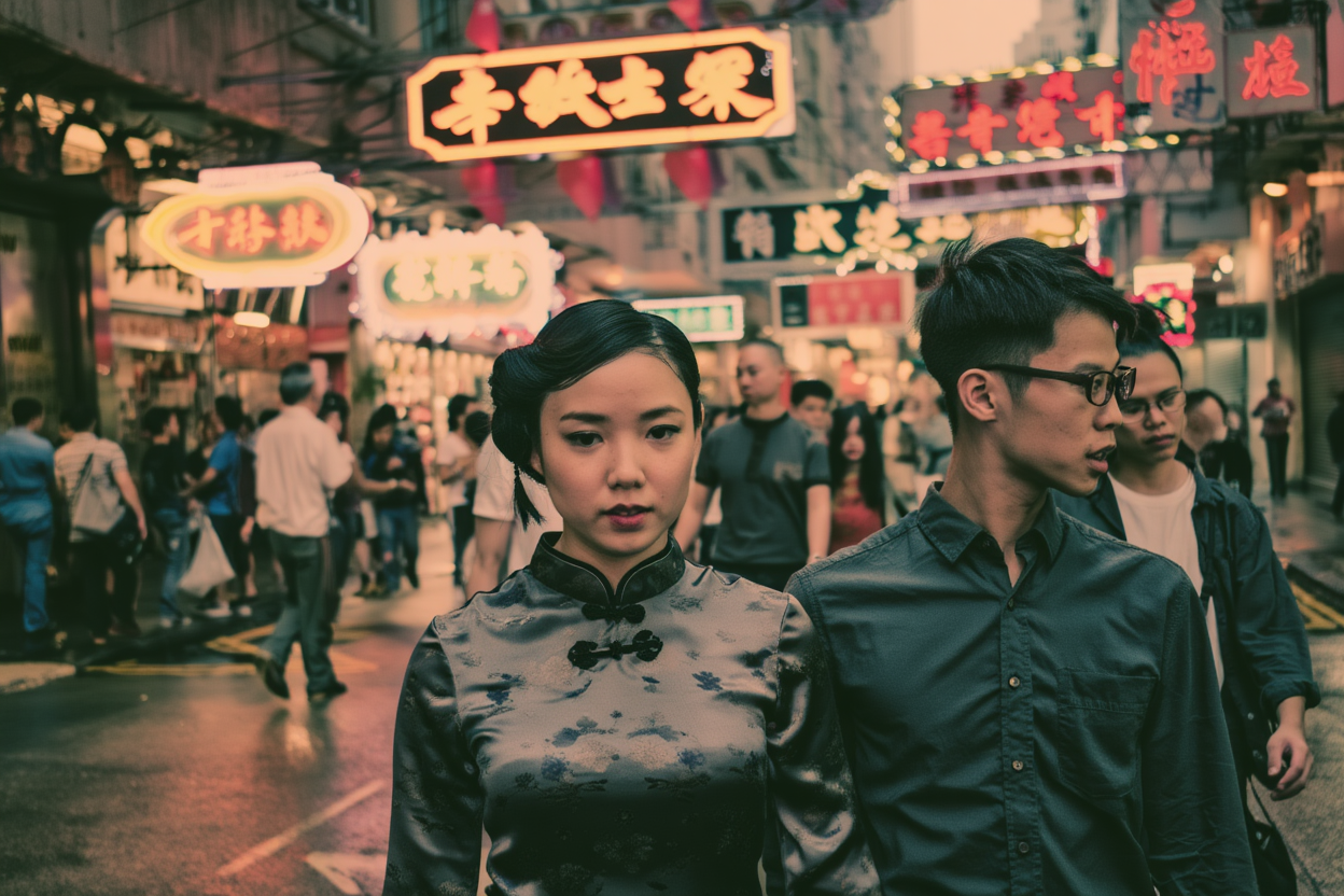 In the neon glow of Hong Kong, 1999, where time danced between tradition and modernity, a young couple walked hand in hand through the bustling streets. Her qipao shimmered with floral whispers, a bridge to the past, while his steady gaze held the promise of tomorrow. Amid the clamor of vendors and the flicker of signs, their silent love wove a quiet thread, a timeless melody in the city’s vibrant symphony, as the night embraced their fleeting moment.